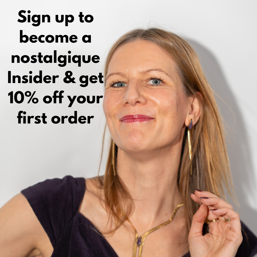 Welcome! I'm Rilana, the founder of and designer behind nostalgique, and I have been in love with jewelry and how it makes me feel since I was little. From wearing my grandma's jewelry and collecting gemstones as a child to making my own beaded necklaces as a teenager and taking a metalsmithing class later in life, jewelry has always been close to my heart. Born in the 80s, I am especially drawn to bold gold pieces from that era and the decades before (hello 70s, I'm specifically talking to you) and my designs reflect that.