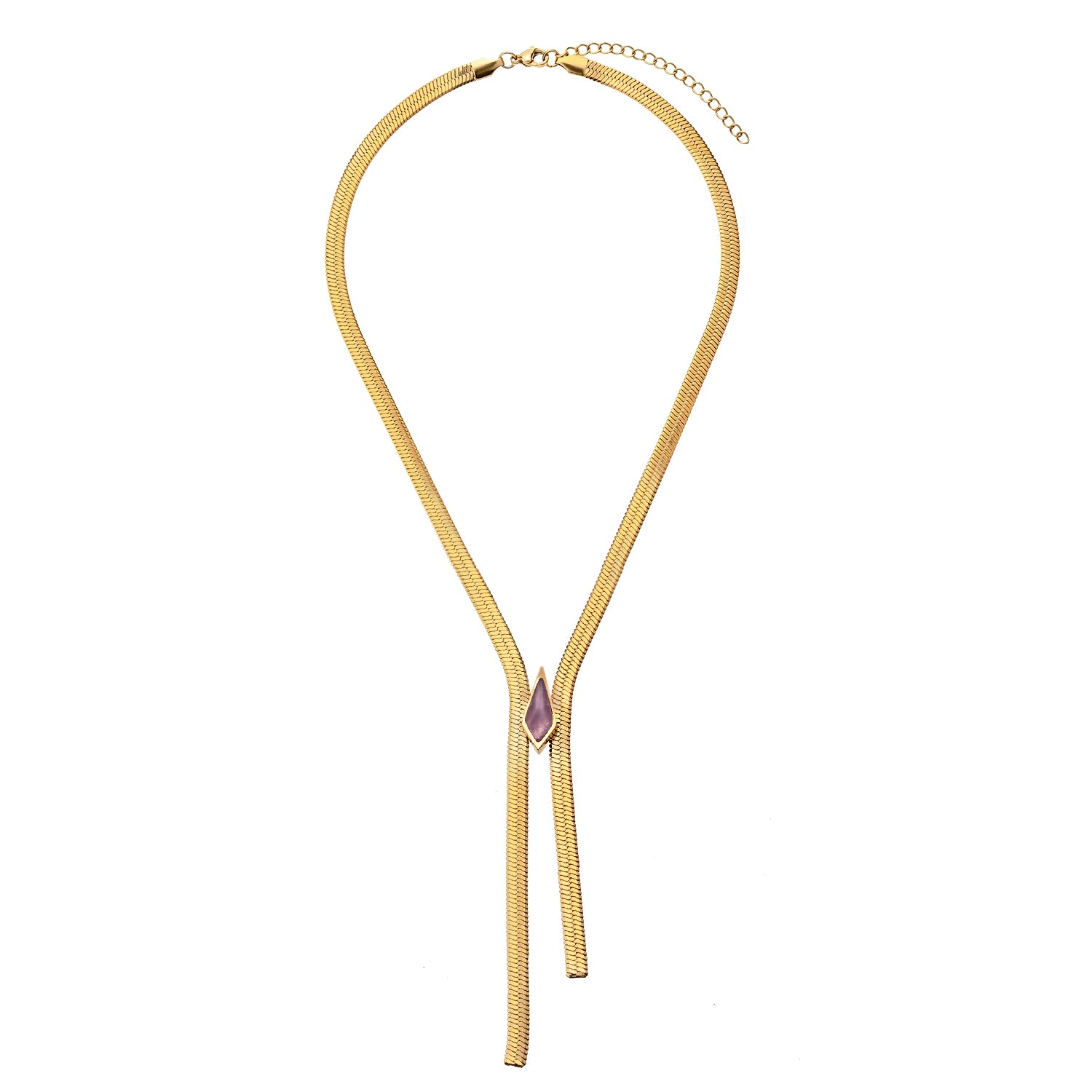 The Dreamscape Amethyst Gold Necklace features a beautiful amethyst stone and invites you to discover the beauty of your imagination. Let your mind wander and feel enchanted with this stunning piece of jewelry!